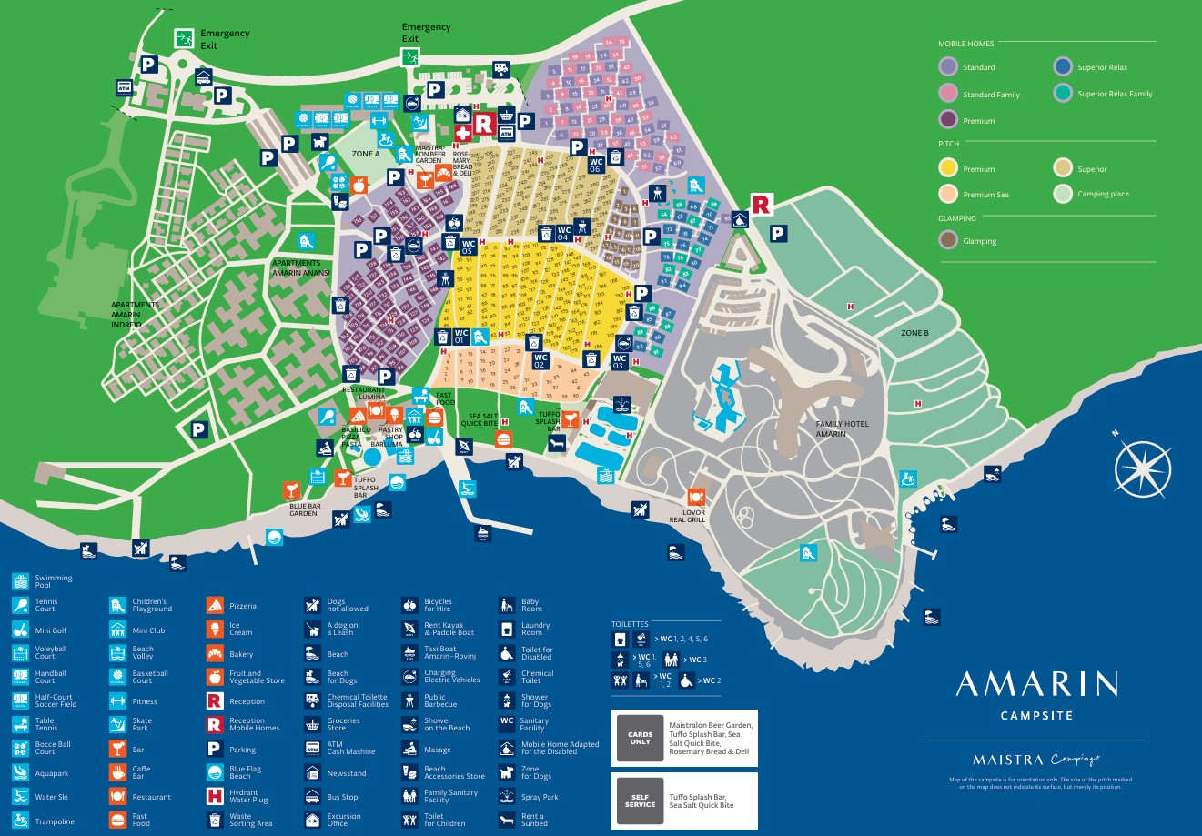 The campsite’ has spacious pitches ranging from 80 m2 to 150 m2. They all have electricity hook-ups, and most have water and sewer connections as well. The nine-hectare surface area by the sea is covered in Mediterranean greenery, providing natural shade. The pitches are divided into five types, from standard to Superior, with the latter being located in the immediate vicinity of the sea.
