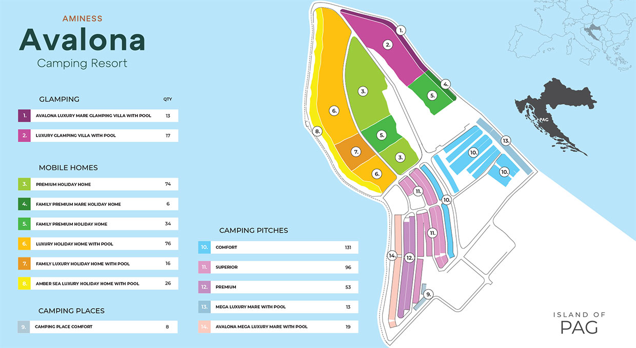 Aminess Style Camping Avalona Resort is located on a small peninsula on the southwestern part of the island of Pag, just a few minutes' drive from Povljana. The resort represents an innovative luxury camping concept, featuring as many as 180 private swimming pools, 30 of which are located on the camping pitches – this is a significant step forward in the context of the quality of the camping offer, even outside Croatian borders.