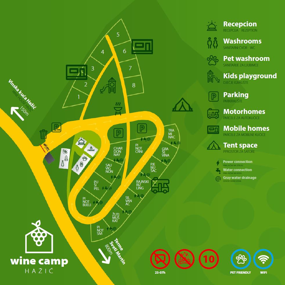 Im nördlichsten Teil Kroatiens, nur 5 km von der slowenischen und 20 km von der ungarischen Grenze entfernt, befindet sich ein einzigartiger Campingplatz – das Wine Camp Hažić. Umgeben von den sanften Hügeln der Gespanschaft Međimurje, wurde der Campingplatz als Teil des Familienbetriebs Hažić angelegt, die sich seit Jahren mit dem ökologischen Anbau von Äpfeln, Weinreben und der Herstellung hochwertiger Weine beschäftigen. Nur 100 m vom Campingplatz entfernt befindet sich das Weinhaus Hažić, das für die Verkostung von Weinen und lokalen Produkten bestimmt ist.