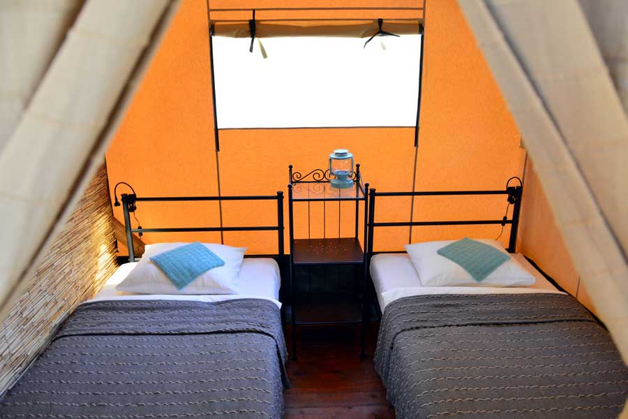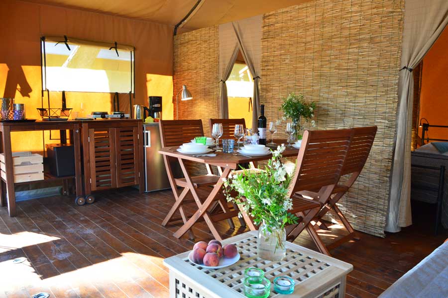Die Safari-Zelte im Glampingdorf „Aquapark“ beinhalten: