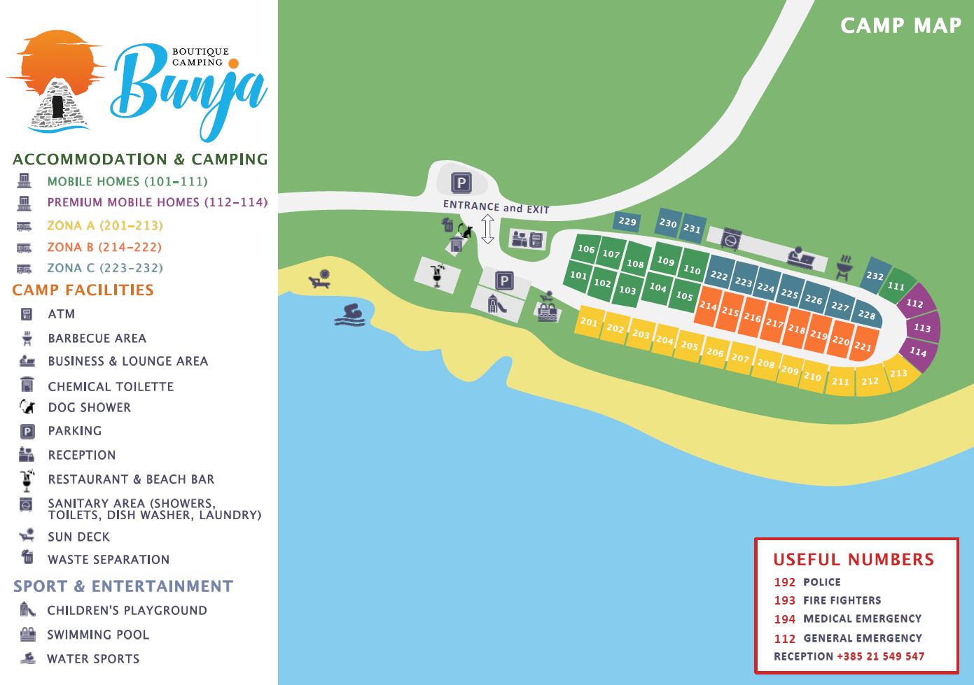 Il Boutique camping Bunja è ubicato nella parte settentrionale dell’isola di Brač (Brazza), a 2,5 km dalla città di Supetar (San Pietro della Brazza). Campeggiando in riva al mare, sotto i pini, gli ospiti possono vivere qui un autentico ritiro nella natura. I tradizionali muretti a secco, una parte preziosa del patrimonio culturale di Brač, contribuiscono a rendere il soggiorno ancora più autentico, mentre la spiaggia di ghiaia invita a nuotare e a rilassarvi ascoltando le melodie dell’orchestra di grilli che raramente potrete sentire da qualche altra parte così forte come in Dalmazia.