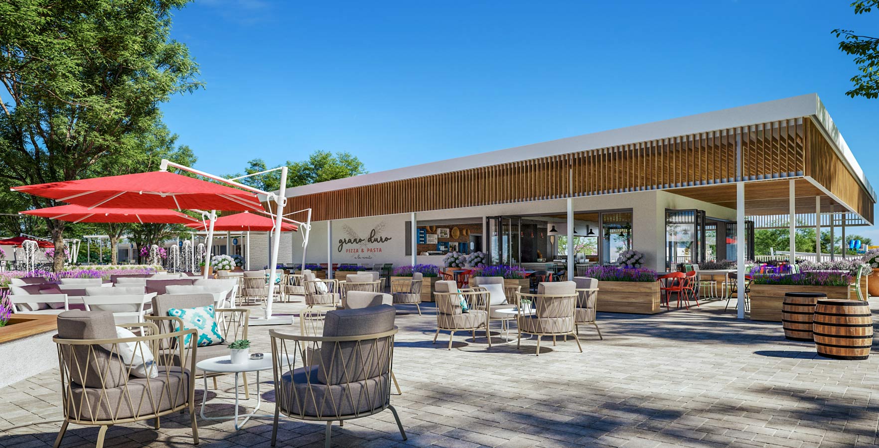 - Piazza – the central campsite square with its Grano Duro Pizza & Pasta restaurant, shops, bars and an event area in a fantastic Mediterranean ambience;