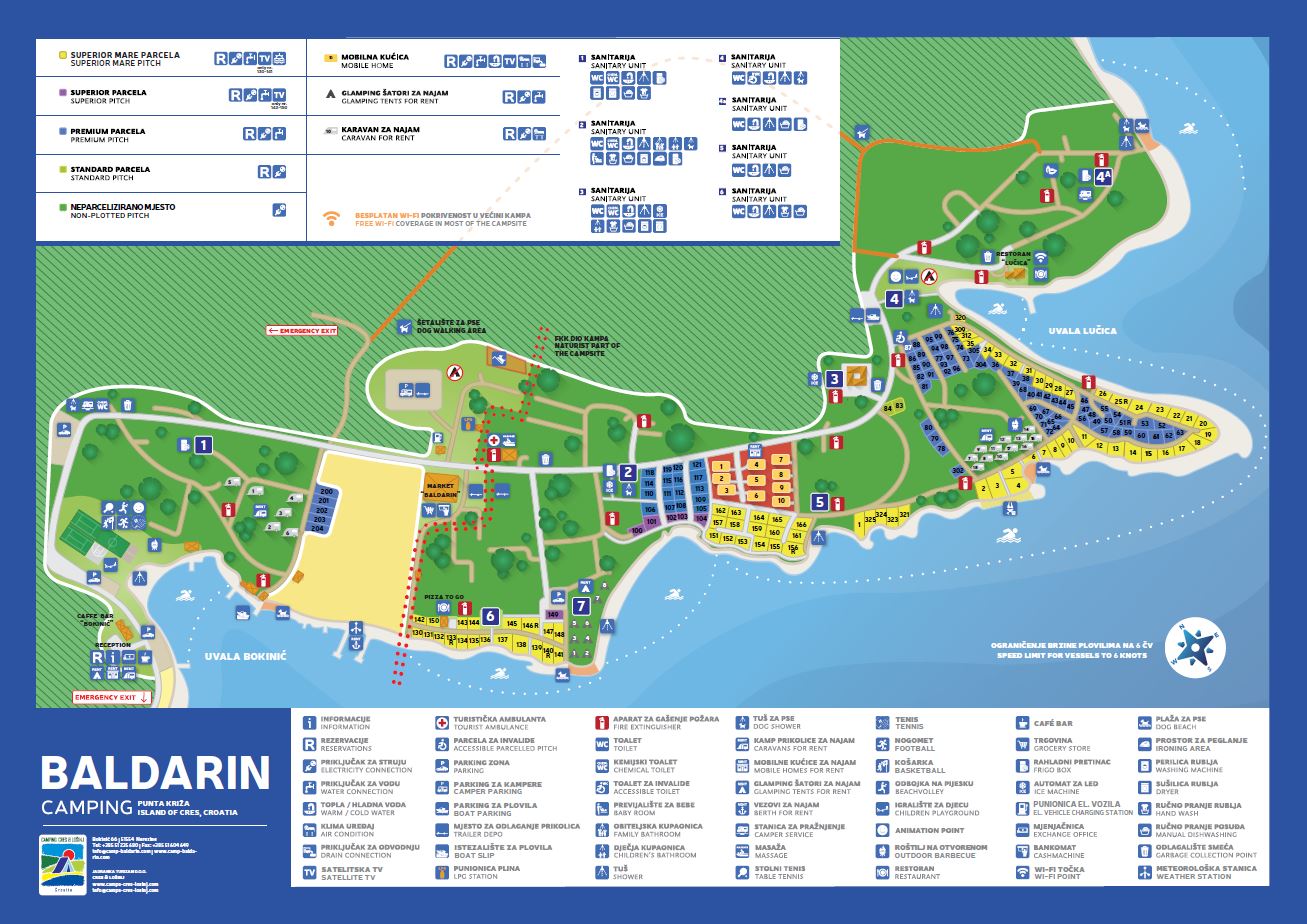 De staanplaatsen op de camping Baldarin variëren in oppervlaktes van 55 tot 169 m2 en zijn voorzien van een stroom- en wateraansluiting, afhankelijk van het type staanplaats. De Superior Mare en Superior staanplaatsen liggen op de eerste rij aan zee, en de staanplaatsen Premium en Standard liggen in de schaduw van het mediterrane bos. Er is ook een niet-verkaveld deel van de camping, in de volksmond de „Robinson-zonem“ genoemd vanwege het dichte bos waardoor gasten alle bijzonderheden van de natuur van het eiland kunnen ervaren.