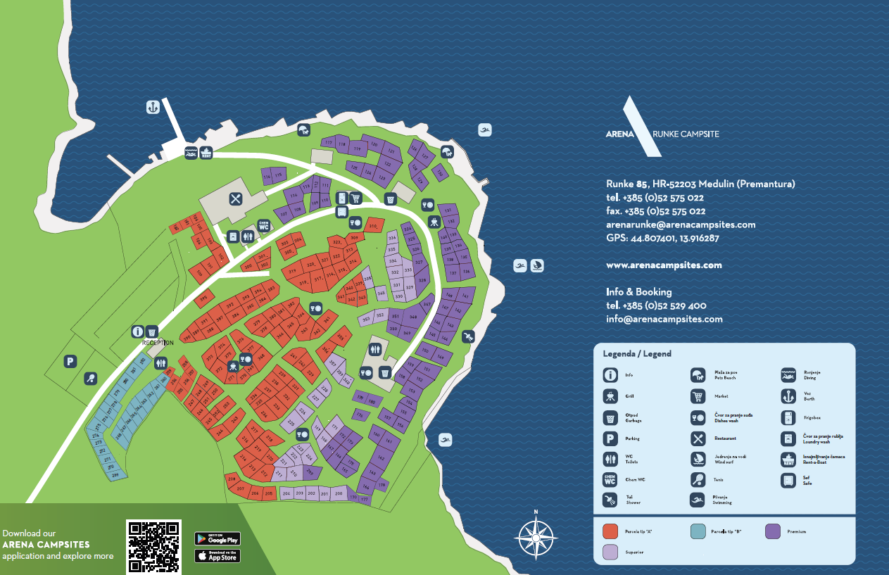Camping Runke ligt op 800 meter afstand van het vissersdorp Premantura, ca. 10 kilometer ten zuiden van Pula, in Istrië en biedt onderdak aan 750 gasten op 247 kampeerplaatsen die in de schaduw van pijnbomen liggen.