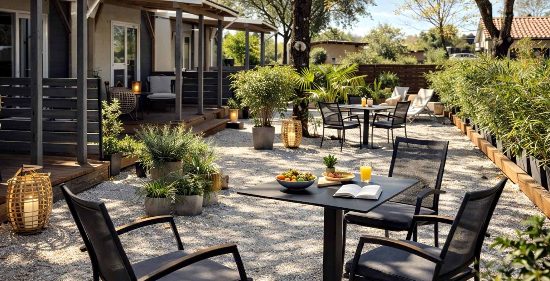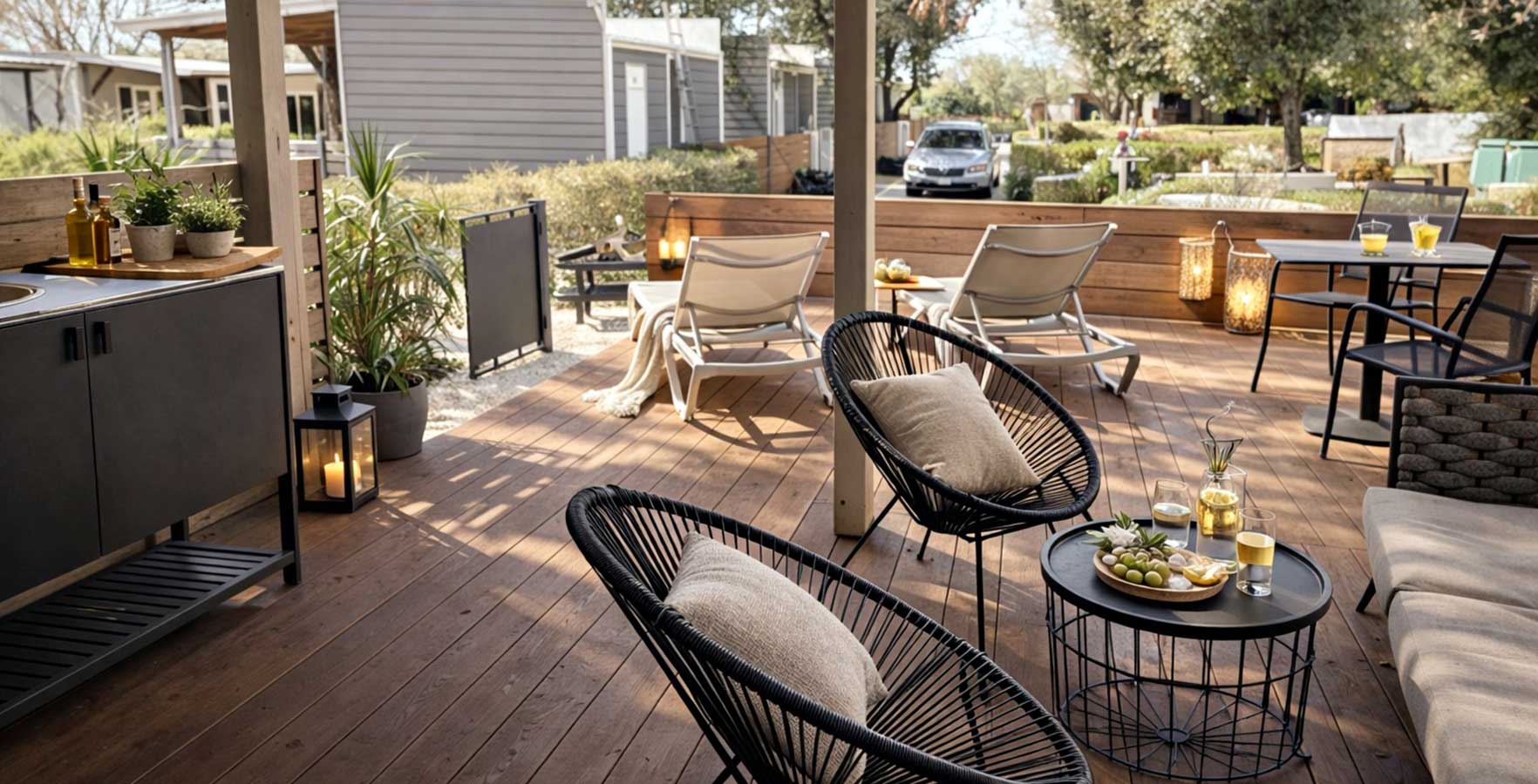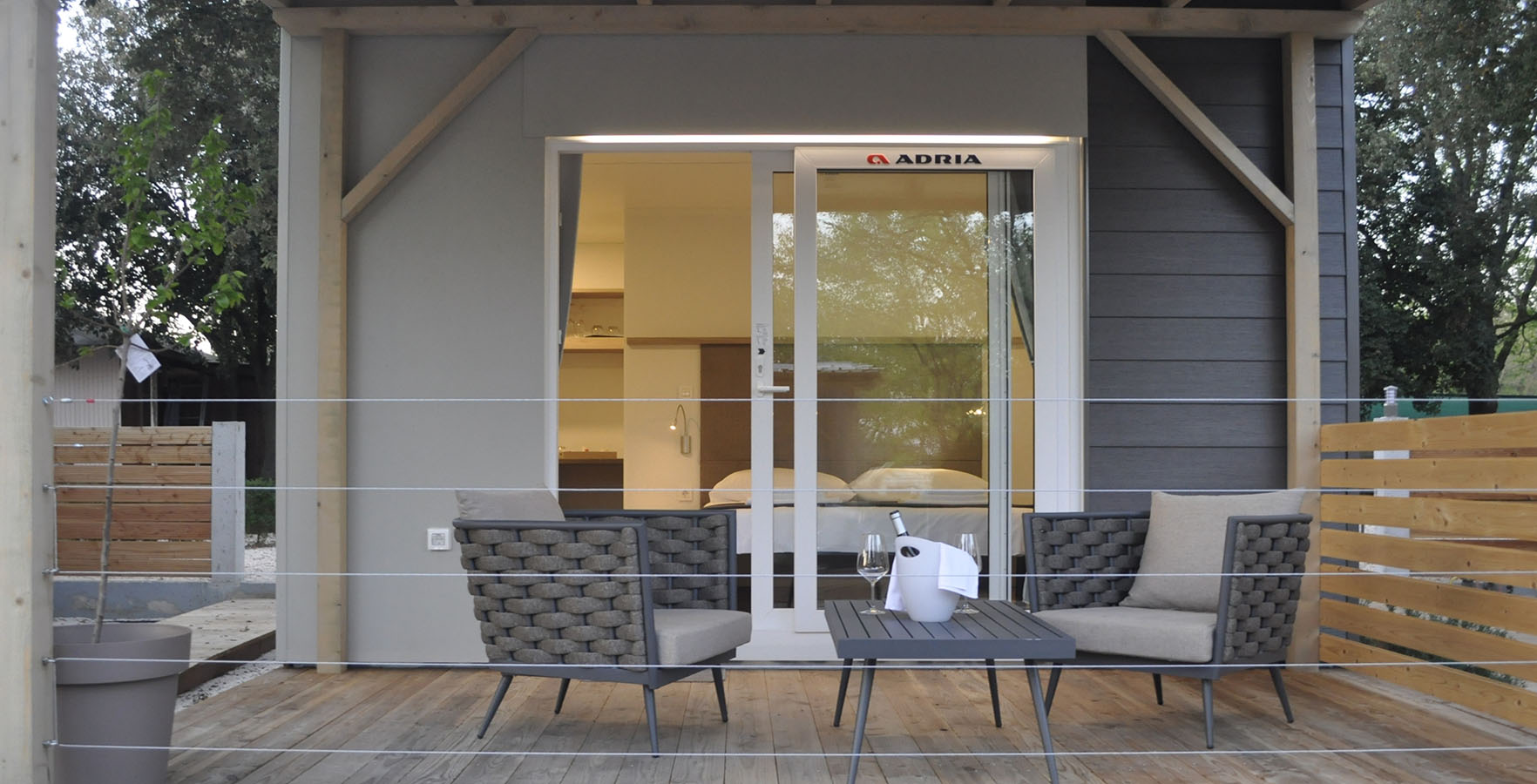 Behalve op staanplaatsen biedt de camping ook accommodatie in uitstekend uitgeruste mobile homes met een keuken, een kamer, een badkamer en een terras met loungemeubilair. Sommige zijn exclusief gereserveerd voor koppels, terwijl in anderen kinderen vanaf 12 jaar en huisdieren zijn toegestaan.