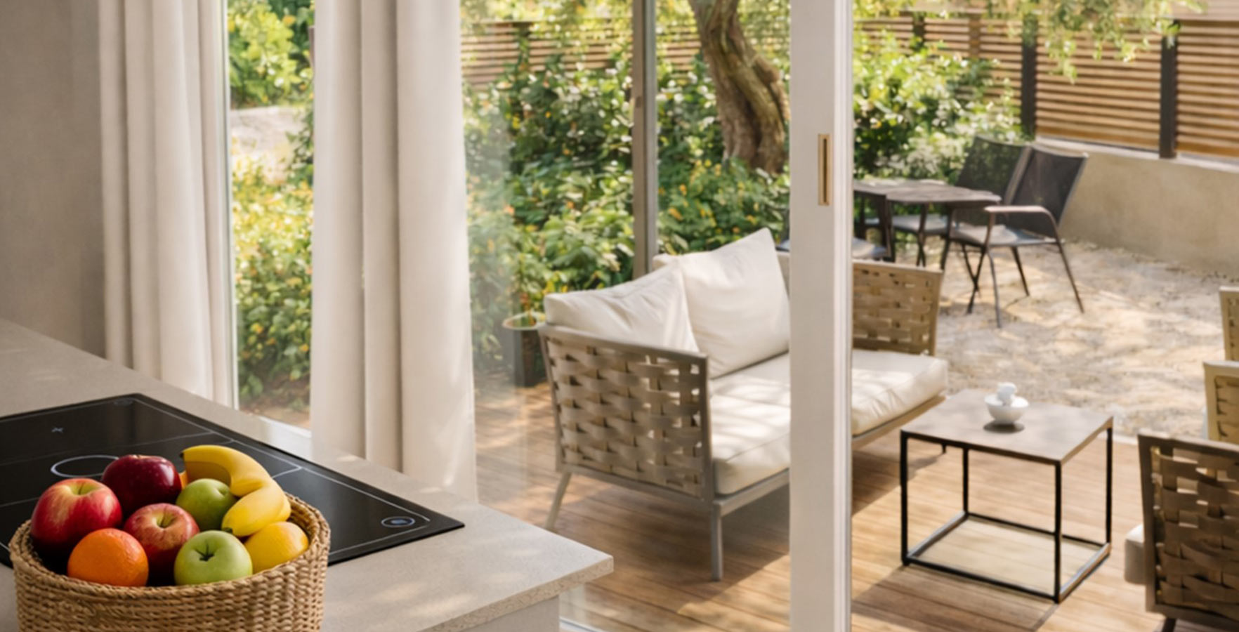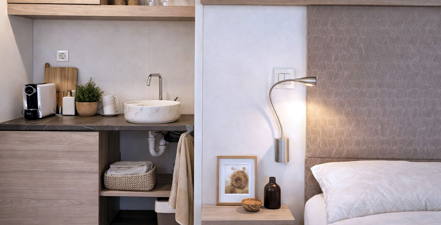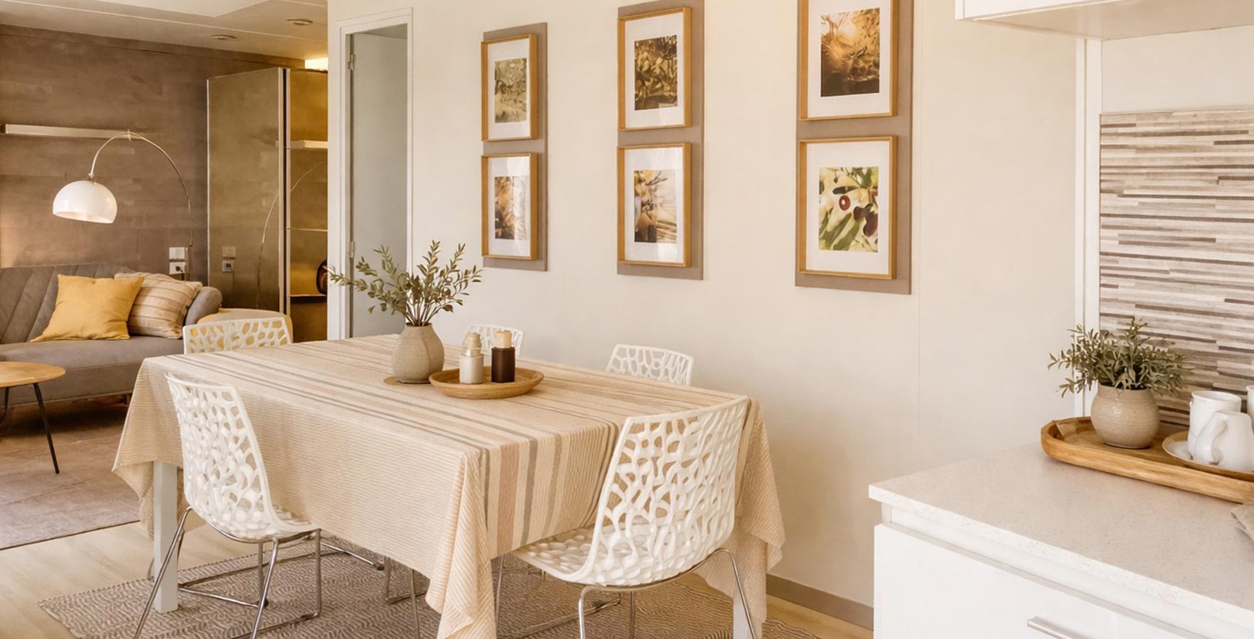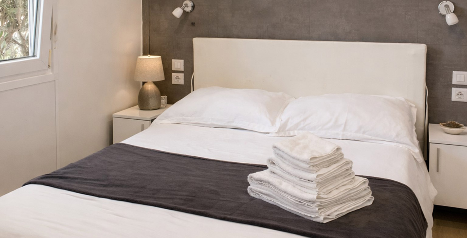 Behalve op staanplaatsen biedt de camping ook accommodatie in uitstekend uitgeruste mobile homes met een keuken, een kamer, een badkamer en een terras met loungemeubilair. Sommige zijn exclusief gereserveerd voor koppels, terwijl in anderen kinderen vanaf 12 jaar en huisdieren zijn toegestaan.