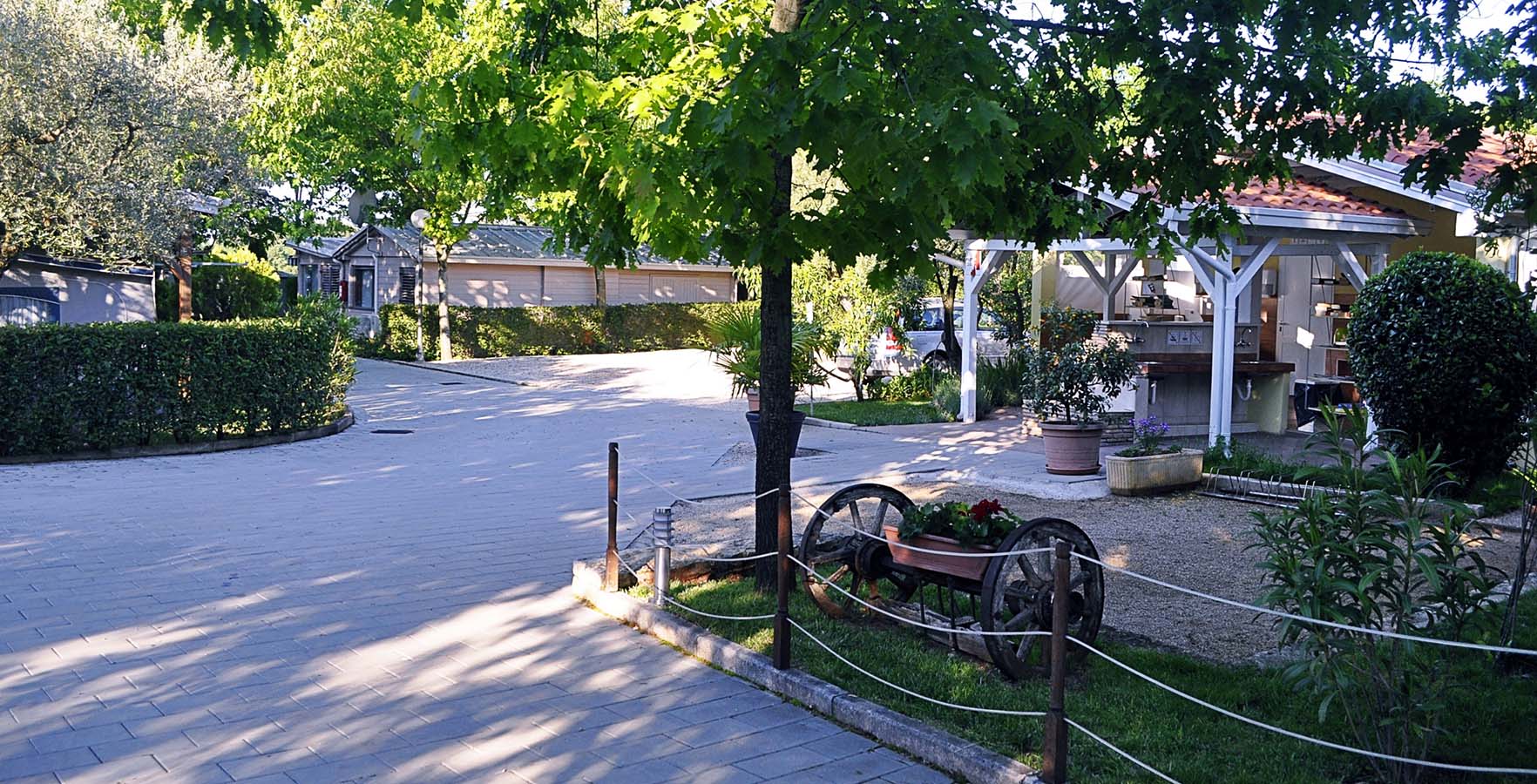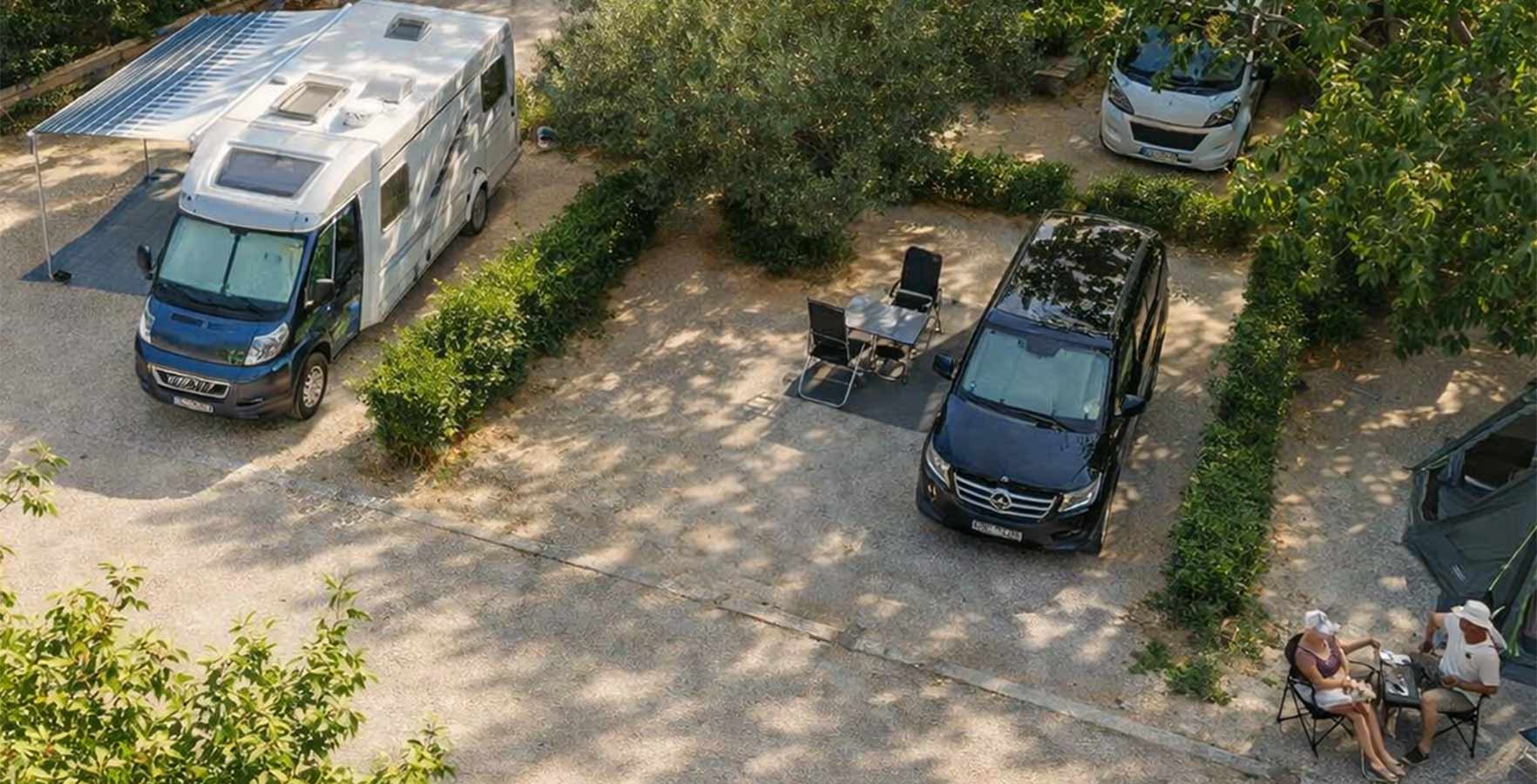 De camping beschikt over slechts een twintigtal staanplaatsen, wat een grote intimiteit en verbondenheid met de natuur garandeert. De staanplaatsen zijn omgeven door een heg en bestrooid met grind, en hun oppervlakte varieert van 80 m2 tot 100 m2. Sommige zijn versierd met de schaduw van grote oude olijfbomen en van de privileges van de moderne tijd beschikken ze over stroom- en wifiaansluitingen en sommige staanplaatsen zijn ook voorzien van een wateraansluiting.