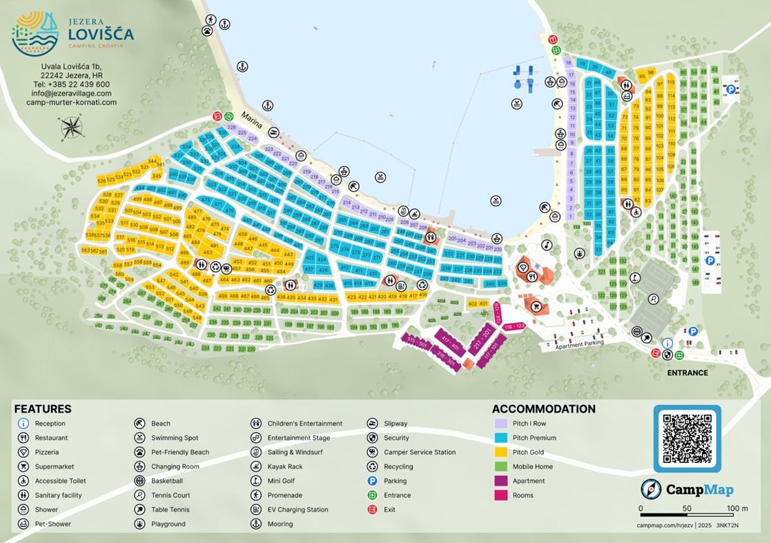 Kamp leži na jugovzhodni obali otoka Murterja, ki je okoli 30 km oddaljen od Šibenika. Je del istoimenskega turističnega kompleksa v neposredni bližini ribiškega mesteca Jezera. Zaliv Lovišća, v katerem leži kamp, nudi naravno zavetje pred močnimi vetrovi in morskimi tokovi, zato je priljubljen med navtiki. Tu je tudi ena od najlepših plaž na Murterju, ki je od kampa oddaljena samo nekaj korakov. V kampu Jezera Lovišća boste uživali v vseh čarih kampiranja na otoku, obenem pa se lahko odpravite na zanimive izlete v okolico.